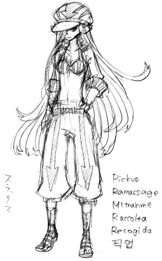ほぼ一発描き決定。非戦闘員だけど性格が「ゆうかん」なので、戦おうと思えば戦えるのでは?って思えそうな見た目にしたかった。右下の文字列は特性「ものひろい」の各国語翻訳メモです。何のためにそんなのメモしたのか覚えてない・・